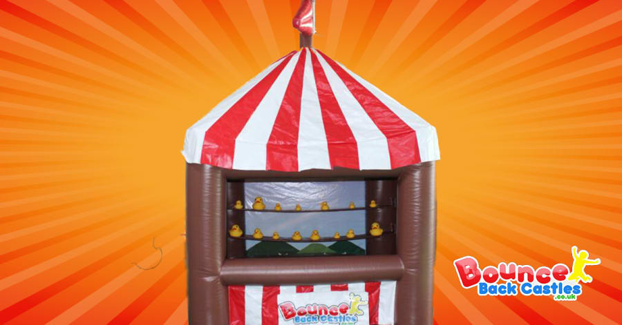As well as our standard Tin Can Alley we also offer this inflatable surround version, that comes in a red and white fairground theme which matches well with our side stall games including Higher or lower & Feed the clown, and of course our Helter Skelter Inflatable Slide! As well as being suitable to be used as a tin can alley you are also able to switch to other objects to use with a nerf gun (not provided).