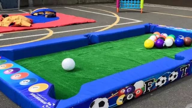 Football pool hire in Norwich, Norfolk and Suffolk comes with a full set of ‘spots and stripes’ pool balls, plus a white ball – all that’s missing is the cue, because in this game, the cue is you! Just step onto the green baize pitch/table and line up your shot.