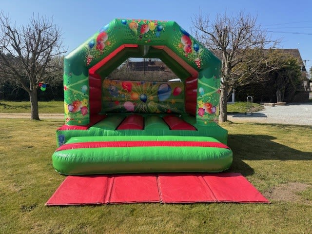 If you would like to hire the Green & Red Party A Frame Bouncy Castle, please click the buttons to check availability and book online, or contact us: