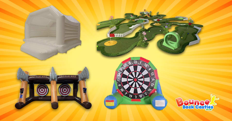 Choose our Wedding Entertainment Wedding Bundle in Norwich, Norfolk and parts of Suffolk and Cambridgeshire for high-impact, worry-free wedding fun. This all-in-one package combines three competitive games and a classic bouncy castle in a white wedding theme. It’s perfect for family-friendly receptions and celebrations, and evening entertainment.